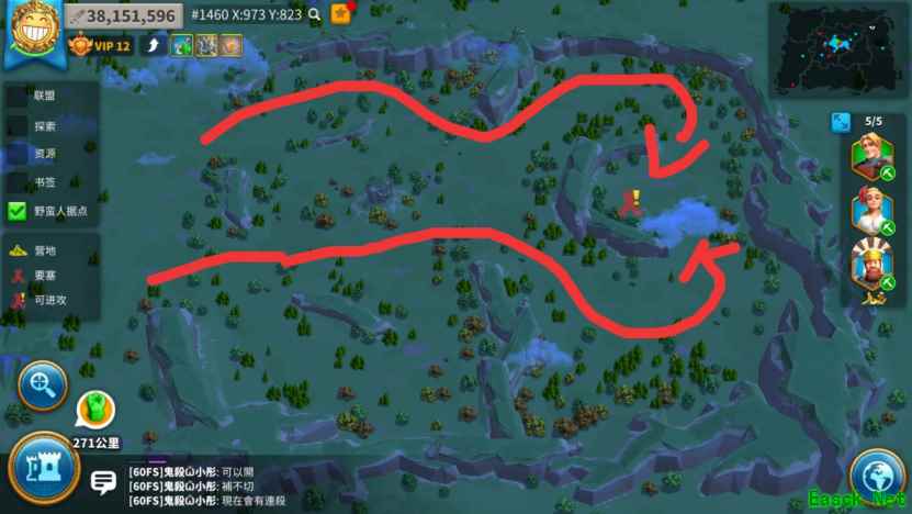 野蛮人要塞坐落于峡谷之中,有两条路可以从峡谷入口达到要塞处,这里推荐所有人一起走,大部队直接图中走上面一条路,因为上面一条路的空地较小,在密度一样的情况下敌人数量会偏小,走另一条路的野蛮人数量较多,很可能会出现没走到要塞部队已经被消耗得所剩无几了。