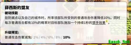再配合阿曼尼的辅助弓兵天赋,能快速释放技能,打出高额伤害。两者属性技能可增加攻击、防御和生命,三维上也比较均衡。 驻防 驻防方面,阿曼尼搭配阿尔特米西亚的驻防也是非常强大的!驻防时阿尔特米西亚三技能【薛西斯的盟友】不但能使受到的普攻伤害减少10%,还能造成一个随机禁手效果。