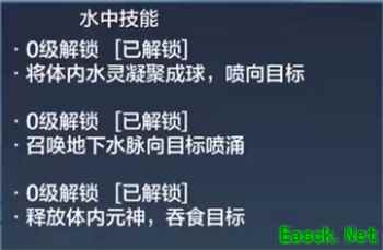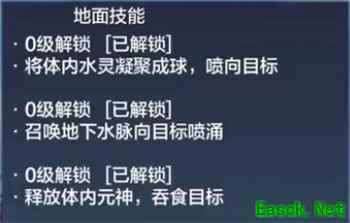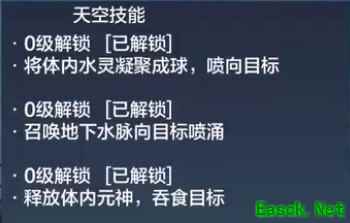 0级解锁[已解锁] 将体内水灵凝聚成球,喷向目标 0级解锁[已解锁] 召唤地下水脉向目标喷涌 ·0级解锁[解锁] 释放体内元神,吞食目标 天空技能