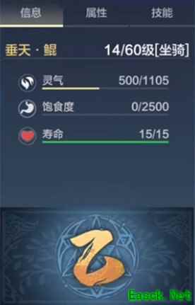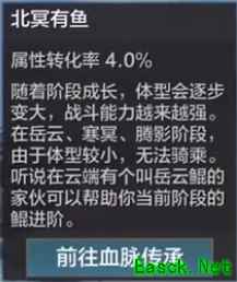 属性转化率4.0% 随着阶段成长,体型会逐步变大,战斗能力越来越强。 在岳云、寒冥、腾影阶段,由于体型较小,无法骑乘。 听说在云端有个叫岳云鲲的家伙可以帮助你当前阶段的鲲进阶。 纵翼云天1级