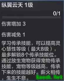 伤害增加3 伤害减免1 学习传承技能,可以提高灵心慧性等级(最大8级),最多解锁8个传承技能位。 通过放生宠物获得宠物传承技能,宠物等级越高,传承下来的技能越好。薪火相传生生不息。 割裂1级