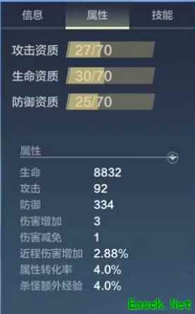 生命:8832 攻击:92 防御:334 伤害增加:3 伤害减免:1 近程伤害增加:2.88% 属性转化率:4.0% 杀怪额外经验:4.0% 技能 地面技能