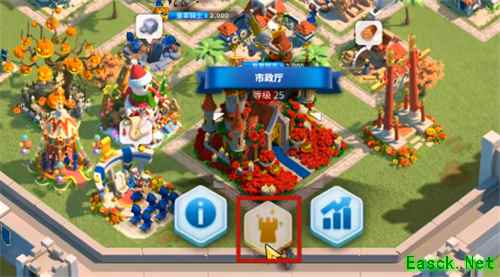 《万国觉醒》城堡皮肤更换方法1、玩家进入游戏后,在大厅内选择市政厅建筑,点击中间黄色塔楼图标。