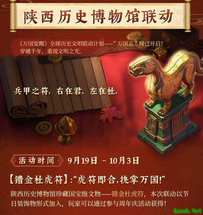3、周年庆期间游戏中还将上线陕西历史博物馆联动活动,玩家可以通过参与活动获取国宝级文物【错金杜虎符】