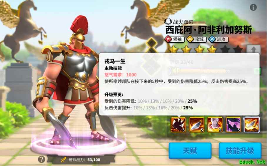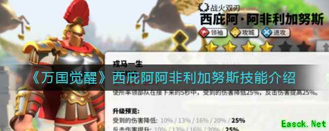 《万国觉醒》西庇阿阿非利加努斯技能介绍戎马一生(主动技能):所率领部队在接下来的五秒中,受到的伤害降低25%,反击伤害提高25% 这个技能的存在提升了西庇阿的生存能力,由于西庇阿可以携带的兵量比较大,如果没有生存能力的技能,这些兵量看似多但都会变成纸老虎,让自己在战场上会受到更大的伤害,得不偿失,而这个技能正好大大提升了西庇阿的生存能力。