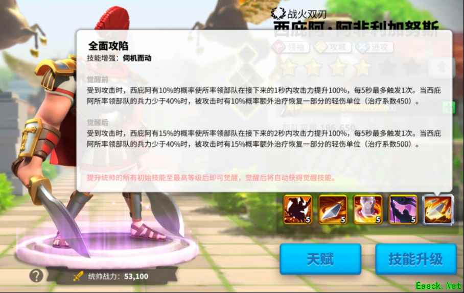 伺机而动(被动技能)、(全面攻陷(觉醒)): 受到攻击时,西庇阿有10%(15%)的概率使率领部队在接下来的1(2)秒内攻击力提升100%,每5秒触发1次。当西庇阿所率领部队的兵力少于40%时,被攻击时有10%(15%)概率额外治疗恢复一部分的轻伤单位,治疗系数450(500) 第一个技能是提高西庇阿的生存能力,而第二个技能就是增加西庇阿的输出能力,配合第一个技能的存在,让西庇阿成为一个既有输出也有生存能力的一个武将。