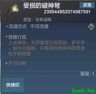 一、受损的破神弩 类型:任务道具 流通方式:不可流通 背景介绍:上古神兵,大羿曾用它诛四凶,铲不平。如今已损毁,只有找到传说中的流金石才能修复。 是修复神弩的任务道具之一。