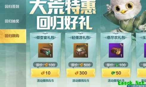十三、回归限购 回归旅者的福利当然不是这么简单啦,咪姐还给所有本次回归的旅者准备了专属折扣礼包,折扣礼包不仅包含经验大餐、宠物礼包,更有贝币和苍玉的专属折扣礼,助力回归的旅者们快速追上进度,和小伙伴们一起游历大荒~