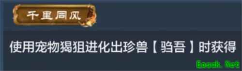 新上线的进化宠物,大小和老虎差不多,身上有五种颜色的斑纹,尾巴比身体还要长。 进化部位:猲狙本体+百年/虎头斐头+孟极尾。合成之后,用驺吾进化丹去进化师那里,进化为驺吾。 根据称号【千里同风】,可知驺吾的本体异兽,必然是【猲狙】。