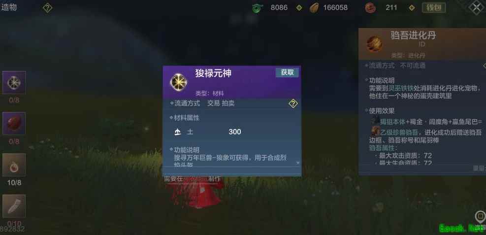 进化丹需要8个万魂 16个元神 驺吾进化丹=八个大象元神+八个狐狸元神+八个万年魂,还有十个类似于相似羽的一个东西 以上是测试服的进化丹情况,材料比较贵,感觉正式服应该会更改 以上就是《妄想山海》驺吾进化丹制作方法的全部内容了,更多手游攻略请关注手游网! 本文内容来源于互联网,如有侵权请联系删除。 |