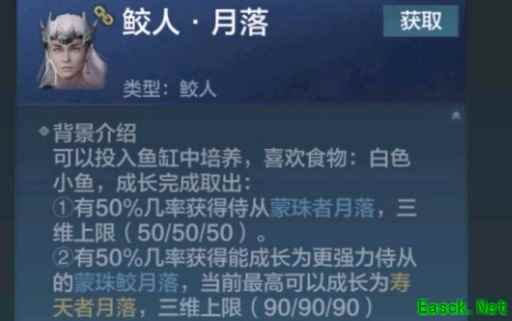 《妄想山海》鲛人资质介绍鲛人月落: 美人鱼鱼苗投入鱼缸中培养,喜欢食物:白色小鱼,成长完成取出。 1、有50%几率获得侍从蒙珠者月落,三维50。 2、有50%几率获得蒙珠鲛月落,三维90。