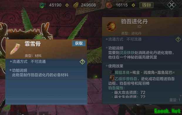 霏雪骨目前还没出,要27号更新才有,我想应该是青佩兑换,具体正式服在看 驺吾资质和具体进化丹材料如图