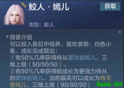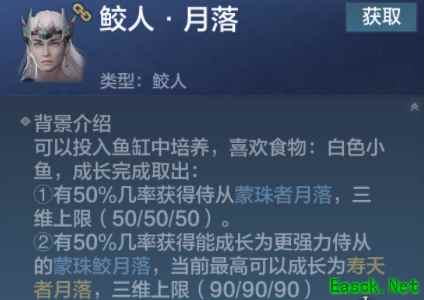 2、鲛人·月落 类型:鲛人 背景介绍 可以投入鱼缸中培养,喜欢食物白色小鱼,成长完成取出。 有50%几率获得侍从蒙珠者月落,三维上限( 50/50/50)。 有50%几率获得能成长为更强力侍从的蒙珠鲛月落,当前最高可以成长为寿天者月落,三维上限( 90/90/90 )。