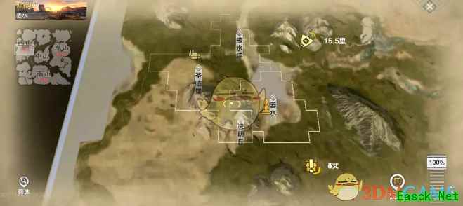 姜水西边一圈山的中间,大概就在标注的位置,沙漠地形,小动物不太难发现的。