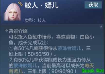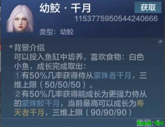 可以投入鱼缸中培养,喜欢食物:白色小鱼,成长完成取出: 1、有50%几率获得侍从蒙珠者干月,三维上限( 50/50/50)。 2、有50%几率获得能成长为更强力侍从的蒙珠鲛千月,当前最高可以成长为寿天者千月,三维上限( 90/90/90 ) 三、嫣儿介绍 类型:鲛人 背景介绍 可以投入鱼缸中培养,喜欢食物白色小鱼,成长完成取出。 有50%几率获得侍从蒙珠者嫣儿,三维上限( 50/50/50)。 有50%几率获得能成长为更强力侍从的蒙珠鲛嫣儿,当前最高可以成长为寿天者嫣儿,三维上限( 90/90/90 )。