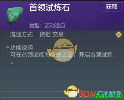 首领试炼石可以用于神人传说图腾召唤出首领。获得方法是:战斗图腾的高级战斗(使用战斗试炼石开启)概率掉落。由于概率比较低,因此首领和神兽试炼石都非常珍贵。