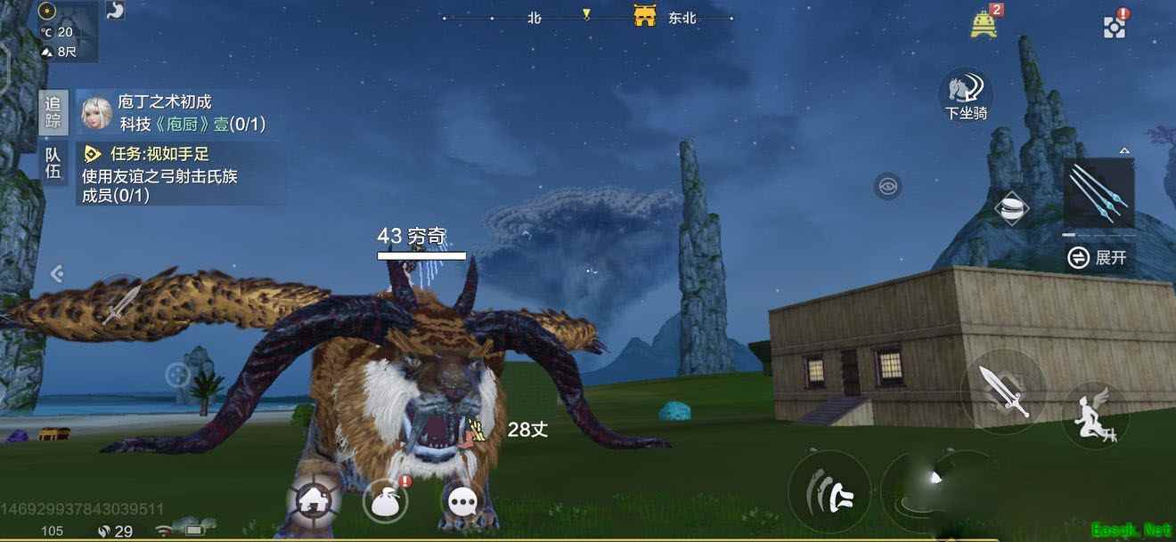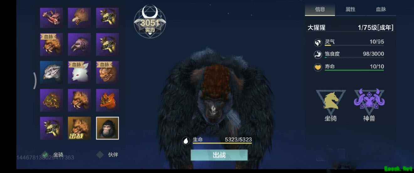 第三名、穷奇 极强的输出能力的神兽,外形凶狠,移动速度和攻击力都非常不错,获取方法是老虎(彘)吞噬颙鸟的翅膀+黄色闾麋的尾巴进化而来。
