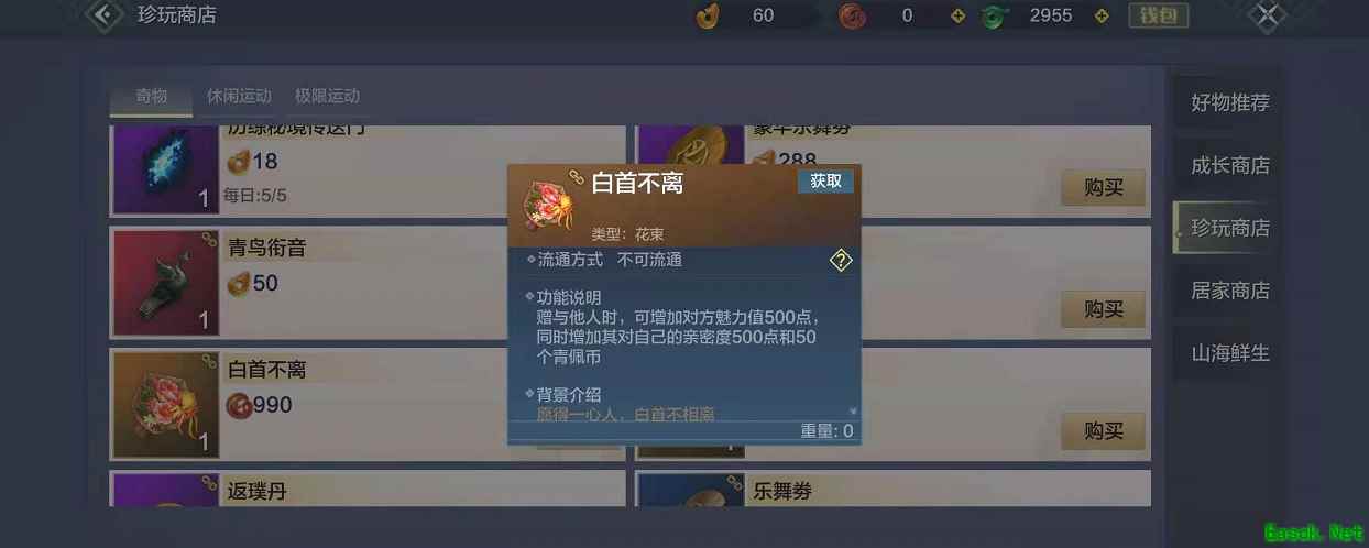 《妄想山海》白首不离花束获取方法一览一、白首不离获得方法 “白首不离”花束目前是不能进行合成的,而且种植台中也没有其合成配方,它只能通过在珍玩商店中花费990勾玉购买或者是一些特定的活动任务才能获取。 游戏中“白首不离”花束可以用来赠送给其他旅者,之后可以增加对方500点魅力值,同时还会增加其对自己的500亲密度,并且还可以获得50个青佩。