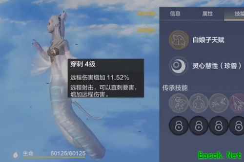 《妄想山海》白娘子属性技能介绍【资质介绍】 目前体验服的资质如下 攻击83 生命79 防御78 【技能介绍】 白娘子天赋 属性转化率5.0% 生命12600 远程伤害增加4.8% 韧性35 防御315 属性转化率决定了宠物在血脉传承中,转化给主人的属性比例 地面技能 0级解锁[已解锁] 聚集能量,发射产生大范围爆破 0级解锁[已解锁] 聚集水能量,在目标位置施放连续水柱冲击 0级解锁[已解锁] 连续甩出水刃刀波,井释放水龙卷风 0级解锁[已解锁] 聚集能量,甩动尾巴拍出 0级解锁[已解锁] 交叉手臂,给友方单位回血