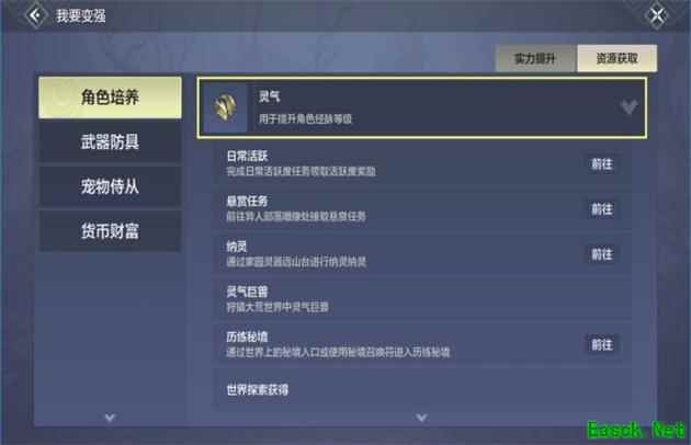 在资源获取页签中,大家可以看到不同成长、武器、宠物、货币资源的可获取途径。点击细分栏的【前往】按钮可以快速指引您前往了解或参与改玩法。