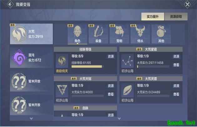 主界面可在【实力提升】及【资源获取】两个页签之间进行切换,最左侧页签栏可切换不同星球的战力面板,点击切换即可看到不同星球成长线当前的成长状态。而成长状态又分为角色、装备、宠物等维度。帮助大家可以更加细致地查看每一项当前的成长进度。