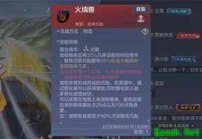 《妄想山海》火㷰兽蛋获取方法【获取方法】 1、火㷰兽是全新的神兽,玩家可以获得和使用,是入手和培养价值极高的宠物,建议玩家尽可能的获得和拥有; 2、第一种获得方式:通过向神兽图腾交付巨兽试炼石,有概率出现应龙、狌狌和火㷰兽,对神兽造成50%血量伤害后即可进行捕捉;