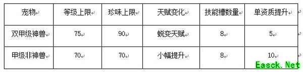 2、廿骨-廿神、龙珠-千年恐龙类、鼃黾皮-万年鼃黾;天蛇牙-千年蛇妖、蠵皮-蠵、蒲夷鱼鳞-万年蒲夷鱼;鹤鸵羽-鹤鸵、羽骏翼-千年羽骏、履雪羽-万年羽骏。材料如此珍贵,宠物提升的属性当然不止一两点!