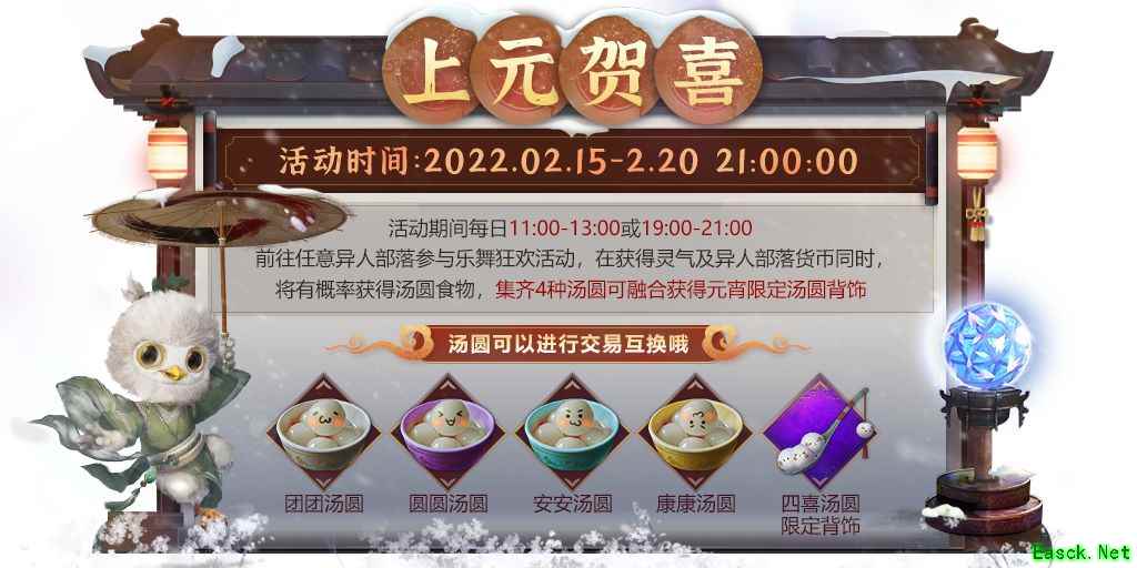 《妄想山海》四喜汤圆获取攻略一、获取方法 参与上元贺喜元宵活动,通过集齐汤圆合成四喜汤圆。 二、活动介绍 1、活动时间:2022年02月15日—02月20日 21:00:00 2、活动期间每日11:00-13:00或19:00-21:00前往任意异人部落参与乐舞狂欢活动,除了可获得大量灵气和异人部落货币之外,将有概率获得不同的汤圆食物道具。 3、集齐团团、圆圆、安安、康康4种不同的汤圆,则可以在背包内合成元宵限定背饰——四喜汤圆。 4、汤圆食物道具可以进行交易,各位旅者也可以和亲朋好友进行互换集齐哦。
