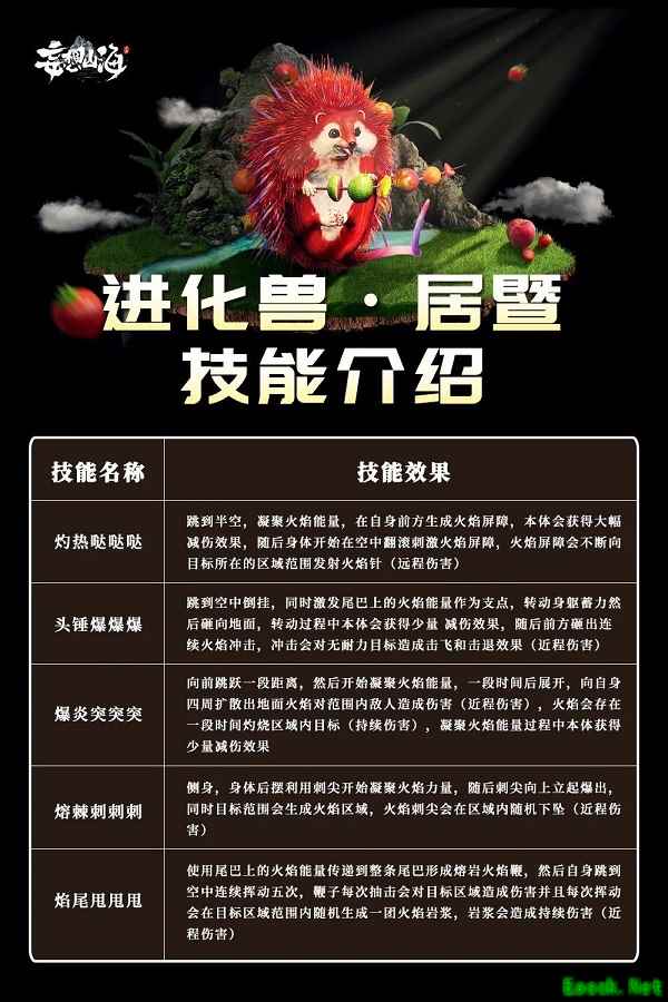 《妄想山海》居暨技能介绍1.虽然外表软萌,可是旅者们可不能小瞧居暨呢!居暨是使用火的进化兽,除了上限可达三万年(甲级),并且与其他进化兽一样血脉转化5%之外,它也是身怀绝技,可以说是玩火玩得炉火纯青! 2.游戏宝小编也为大家整理了它的技能介绍,方便各位旅者更好地了解这只奶凶奶凶的“小刺猬”。
