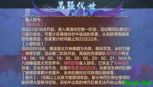 4、神罚巨兽会在【18:00、19:00、19.30、20:00、20:30、21:00】这些时间段分6波降临到游戏中。 5、玩家可以在这些时段内寻找神罚巨兽,并且将其击杀,不过只有15级以上的玩家才能获得奖励。
