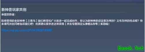 就在今天有很多玩家收到了来自官方的邮件,邀请参与新神兽玩家共创计划。 亲爱的旅者: 即将登场的全新神兽【三青鸟】我们希望和广大旅者一起完成创作,你认为新神兽的设定是怎样的?又有怎样的特点?快来填写共创问卷告诉我们吧!优质建议提供者还将获得【共生专属限定头像框&称号】奖励哦! 根据问卷的预告,新神兽三青鸟即将在7月份上线,并且有可能会拥有三种形态。
