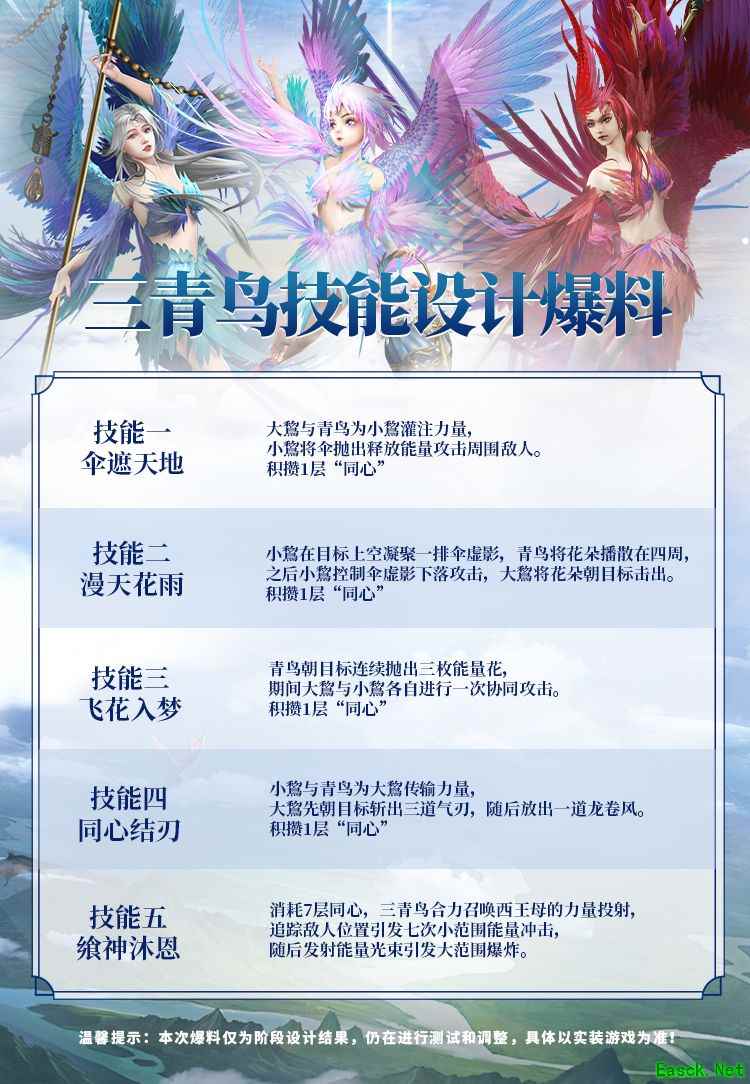 《妄想山海》三青鸟技能介绍三青鸟这个宠物并不是净化宠,这个宠物的技能是攻击型的。 1、这个宠物的技能都是使用伞来进行攻击,而且三青鸟配合来攻击。 2、它的五个技能前四个可以积攒同心效果,第五个技能消耗7层来释放。 具体的技能效果如图: