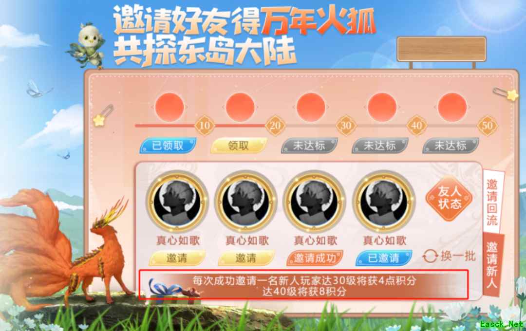 《妄想山海》二周年免费万年火狐领取攻略:只要邀请好友就能免费领超可爱万年·火狐! 2023年1月6日更新后-2023年1月16日活动期间,旅者可通过邀请流失旅者获得活动进度积分,积分累计到一定值即可对应解锁幼兽自选礼盒、邪巫密卷、万年火狐礼盒等进度奖励! 活动规则 ● 邀请对象:流失旅者(连续14日以上未登录游戏) ● 积分获取规则:回流旅者受邀重新登录后即算邀请成功,邀请玩家即可获得8点进度积分; ● 待邀请名单刷新规则:系统将于每日凌晨5点从旅者的社交关系好友中拉取40位符合条件的用户进入待邀请名单,新增好友将有概率于次日刷新进入旅者的待邀请列表; 特别提醒 ● 邀请成功后存在一定的时间延迟,若邀请成功后未正常获得进度积分,请尝试重新登录游戏。