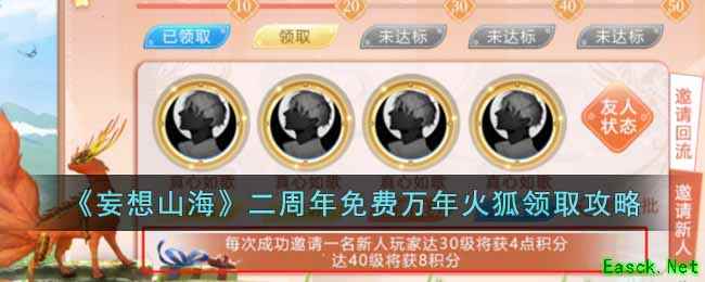 妄想山海二周年免费万年火狐怎么领取?活动期间旅者可通过邀请流失旅者获得活动进度积分,积分累计到一定值即可对应解锁幼兽自选礼盒、邪巫密卷、万年火狐礼盒等进度奖励!小编给大家整理了详细的二周年免费万年火狐领取攻略,有需要的小伙伴一起来看看吧。