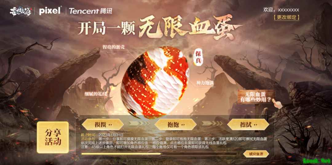 《妄想山海》无限血蛋活动攻略:由各位旅者共创投票选出的二周年版本福利“无限血蛋”终于要来了!2023年1月6日更新后-2023年1月26日活动期间,旅者只要完成以下简单的每日任务,就可以获得一颗无限血蛋了! 马头策划共工在直播发布会时的设想终于成真了! 具体任务内容包括:①每日分享无限血蛋活动;②每日登录妄想山海游戏;③每日活跃值达到 120。 完成以上每日任务即可获得感应值,感应值累计到一定值即可获得无限血蛋!除了可以增加感应值以外,完成每日任务还可以获得对应的额外奖励: ①完成分享任务可获得:天冲丹*3;②完成 登录任务可获得:山海一锅出*2;③完成每日活跃值任务可获得:化育丹*5,每日都可获得一次,千万不要错过哦! 特别提醒 ● 只有45级以上角色才能打开无限血蛋礼包,且每个账号仅限一个角色可激活活动资格,确认激活后,活动资格将与该角色绑定,旅者可要看清之后再绑定!