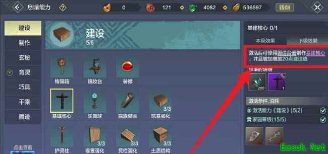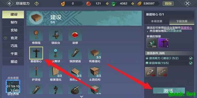 3、进入建设页面后,如下图所示,选择基建核心将其激活。