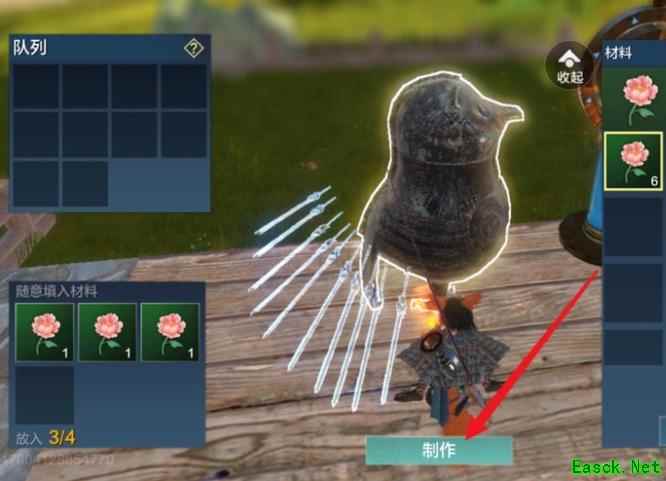 3、接着在右侧列表,放入三个丹炉红材料,点击制作。就可以合成丹炉红花束了。