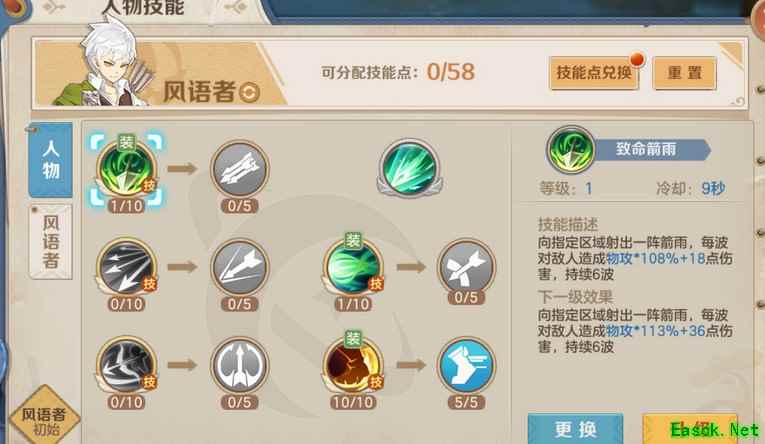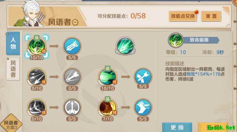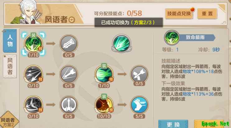 第二套pk加点2个小技能1级,分裂箭不点,疾跑满,疾跑解控韧性满,分裂5,分裂破防满,大满,大满以后再点后面5级分裂。,后跳箭没学,主要是技能位置放不下,有喜欢用的可以点,换掉一个小技能,风语pk主要就是放大然后射,对面控我们开疾跑风筝,在疾跑的4秒冷却器,放宠物的一个控制,拖过去接着风筝。推荐pk带有控的宠物,风龙,熊猫,凤鸾等