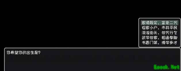 第三个大选项 富二代:开局有1000块启动资金,美滋滋 平民:敏捷+3幸运+3,还不错 乞丐:获得一个乞丐服,隐藏东西 武学世家:物理攻击+3最大生命值+75,还有一个隐藏的好东西,先挖个坑 书香门第:魔法攻击+2,法力+50