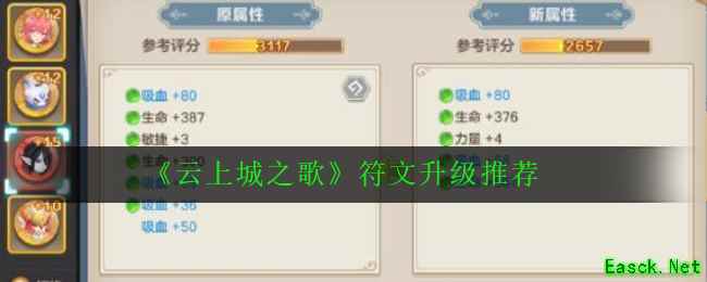 《云上城之歌》符文升级推荐符文在进化的阶段也会存在一定升星失败的风险,但是升星失败的同时可以累加祝福值,也就是失败达到一定次数之后可直升至保底等级。 一般情况下建议只升红色和橙色符文,因为这两个升星加的评分比较高,也就是属性加的效果会更好,因为红色符文的碎片比较难收集前期建议先升级橙色符文,一般升到8-10级就可以暂定升级,起到一个保分的位置,因为升级起到6级之后符文升级失败的概率会很大,所以一般升到8级就可以了。 如果有红色符文的话建议先升级红色符文,也是先升到8级左右,因为这样可以避免升级失败损失的符文精华材料。如果材料充足的情况下可以接着之后升级。