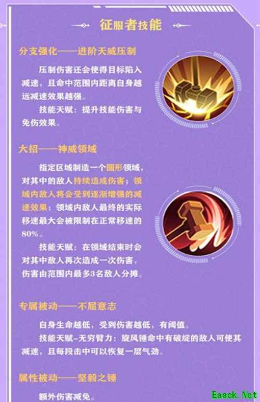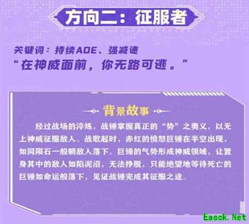 二、技能介绍 1.职业被动——势大力沉 战锤进入战斗之后会获得[气劲],脱战后[气劲]会随时间自然消散,释放普攻会消耗[气劲],并造成额外的伤害,使得目标暴露[破绽],为战锤带来更多的伤害增幅,战锤消耗气劲的层数越多[破绽]持续时间越长。 2.输出——旋风锤 战锤把锤子投出,对前方矩形范围敌人造成一次伤害;锤子达到终点后将会迅速返回,对同样范围内的敌人再造成一次伤害。 技能天赋:该技能附带吸血效果 3.输出——重锤裂地 战锤猛击身前地面,对前方扇形范围内敌人造成一次伤害,击中时会展现出击飞效果,但不会造成实际的控制效果。 技能天赋:被击中的目标会受到减速效果。
