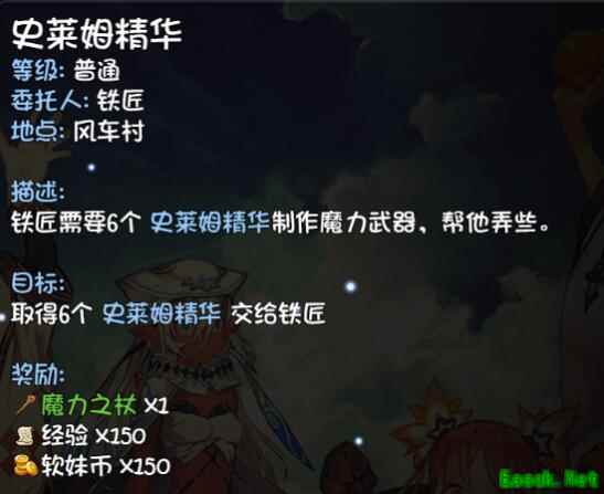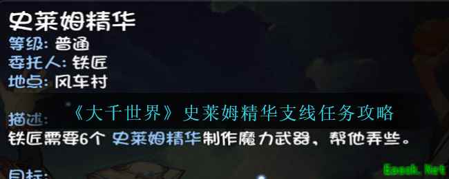 《大千世界》史莱姆精华支线任务攻略史莱姆精华任务描述: 等级:普通 委托人:铁匠 地点:风车村 描述:铁匠需要6个史莱姆精华制作魔力武器,帮他弄些。 目标:取得6个史莱姆精华交给铁匠
