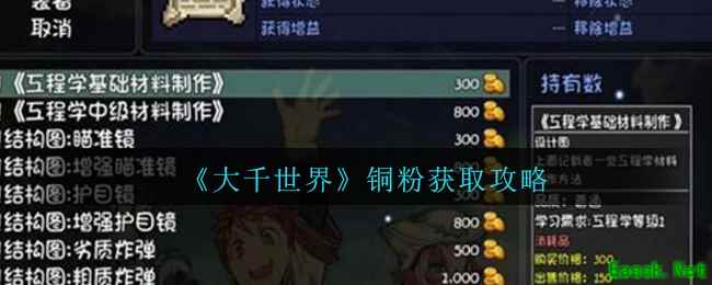 大千世界铜粉获取攻略制作方法 1、首先玩家可以通过刷图获得一些铜矿,铜矿的产出一般在比较低级的怪物身上。 2、有了铜矿之后玩家前往临海镇的市政厅。 3、在市政厅玩家可以买到工程研究初级图纸,学会了之后玩家就可以将铜矿制作成铜粉。 具体流程 1、首先玩家进入游戏之后找到自己菜单,在菜单中有一个制作栏的选项,点击打开。 2、接下来玩家选择工程选项,就能看到很多工程材料的制作了。 3、选择铜粉之后进行制作,就会自动消耗掉原材帮助玩家做出铜粉。 以上就是小编整理的大千世界铜粉获取攻略了,如果想了解更多关于游戏相关资讯,请点击关注手游网。 本文内容来源于互联网,如有侵权请联系删除。 |