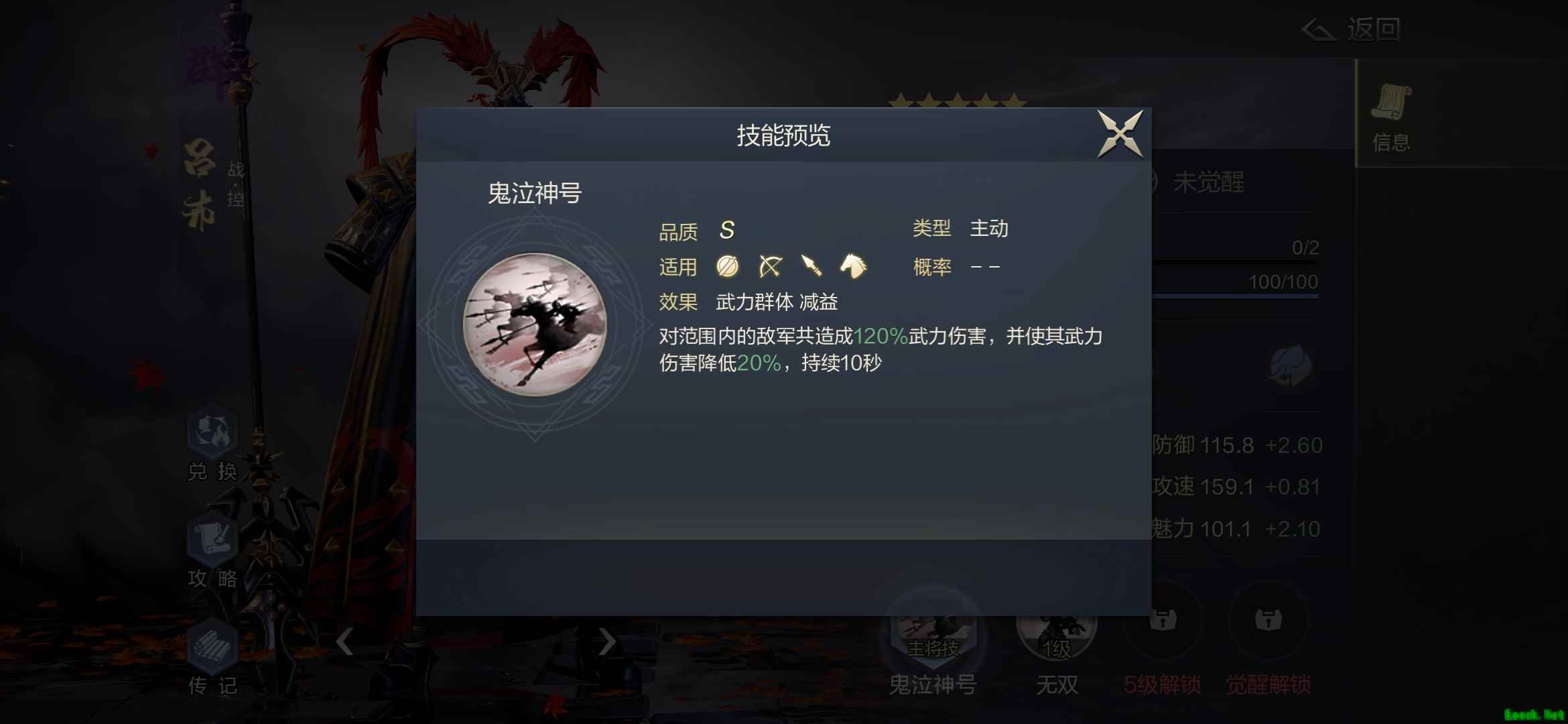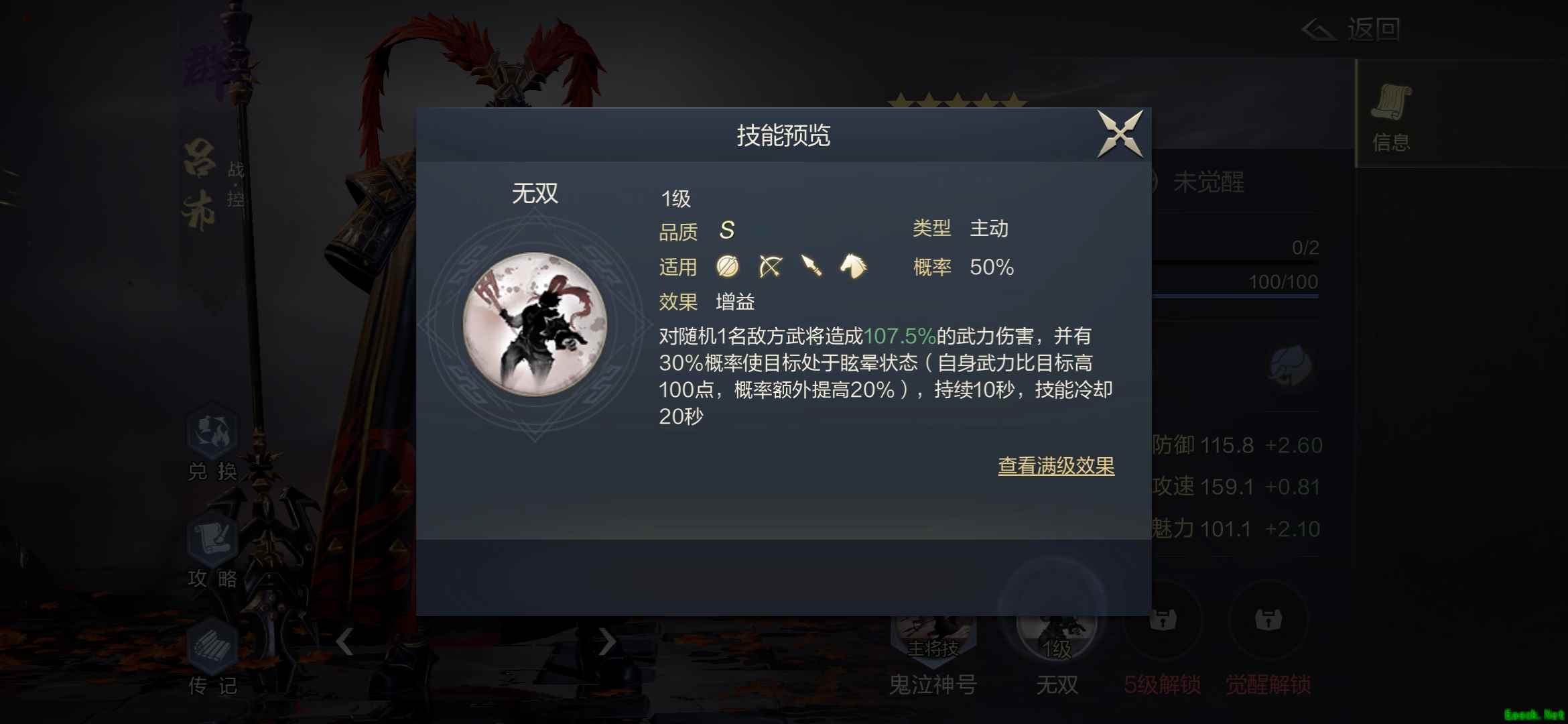 【武将属性与羁绊大全】 《鸿图之下》吕布属性与羁绊大全强度分析 吕布,输出极强的角色,还有不俗的控制,即使混搭也有极强的战斗能力,又能打又硬,不过非常怕诸葛亮!48的智力实在过分,遇到诸葛亮就完克。 面板属性