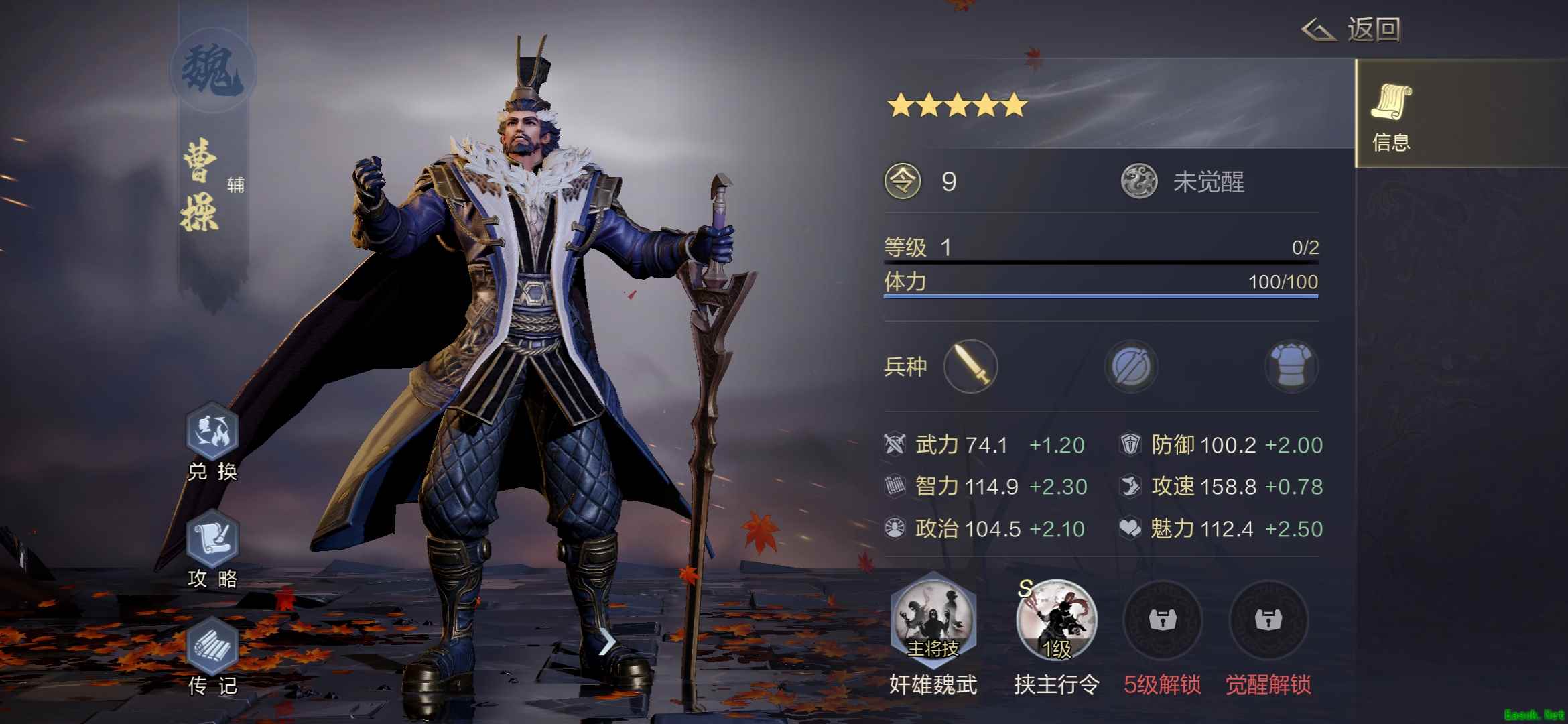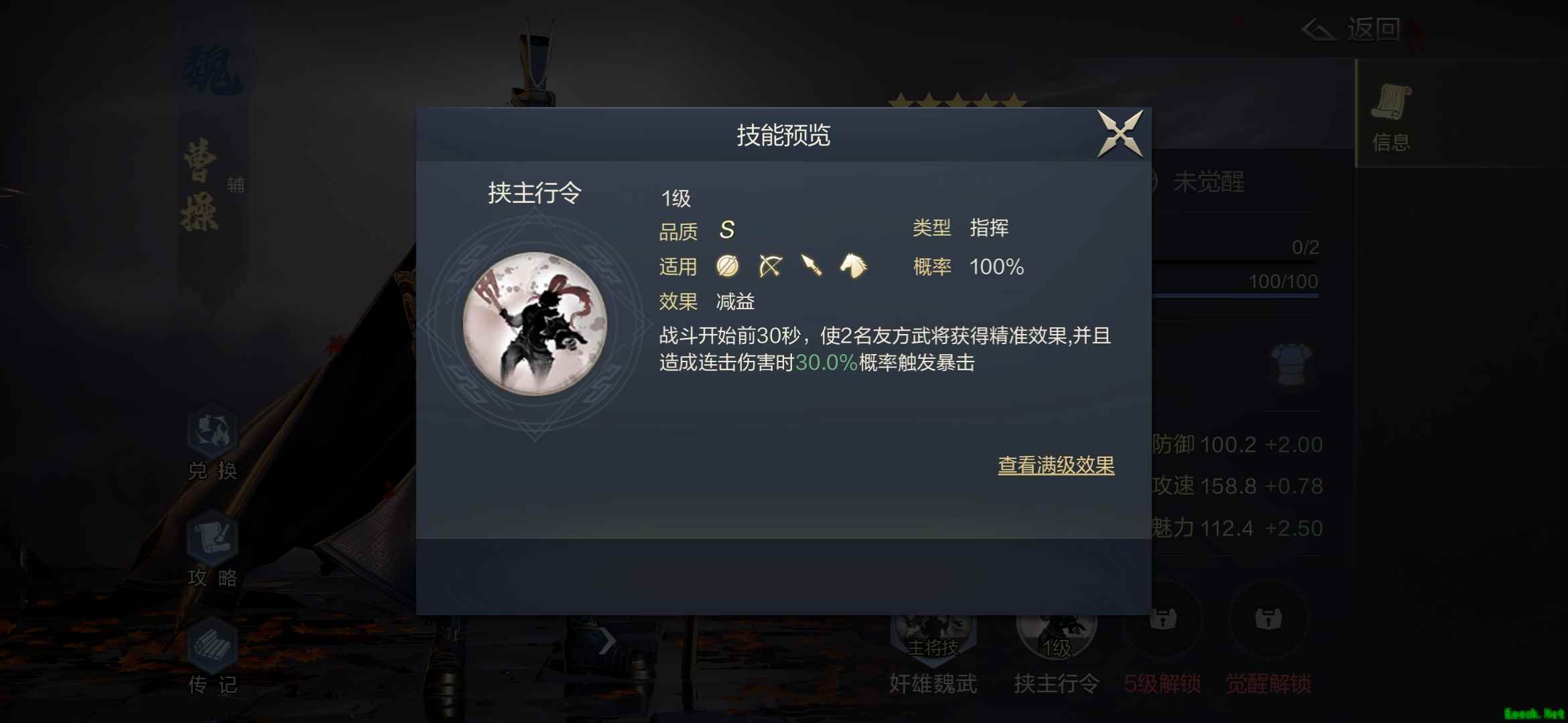 【武将属性与羁绊大全】 《鸿图之下》曹操属性与羁绊大全强度分析 作为三皇之一的曹操,强度非常不错,主将时克制连击队,而本身也是连击队的强力辅助,暴击精准的武技让其爆发能力惊人的强。 面板属性