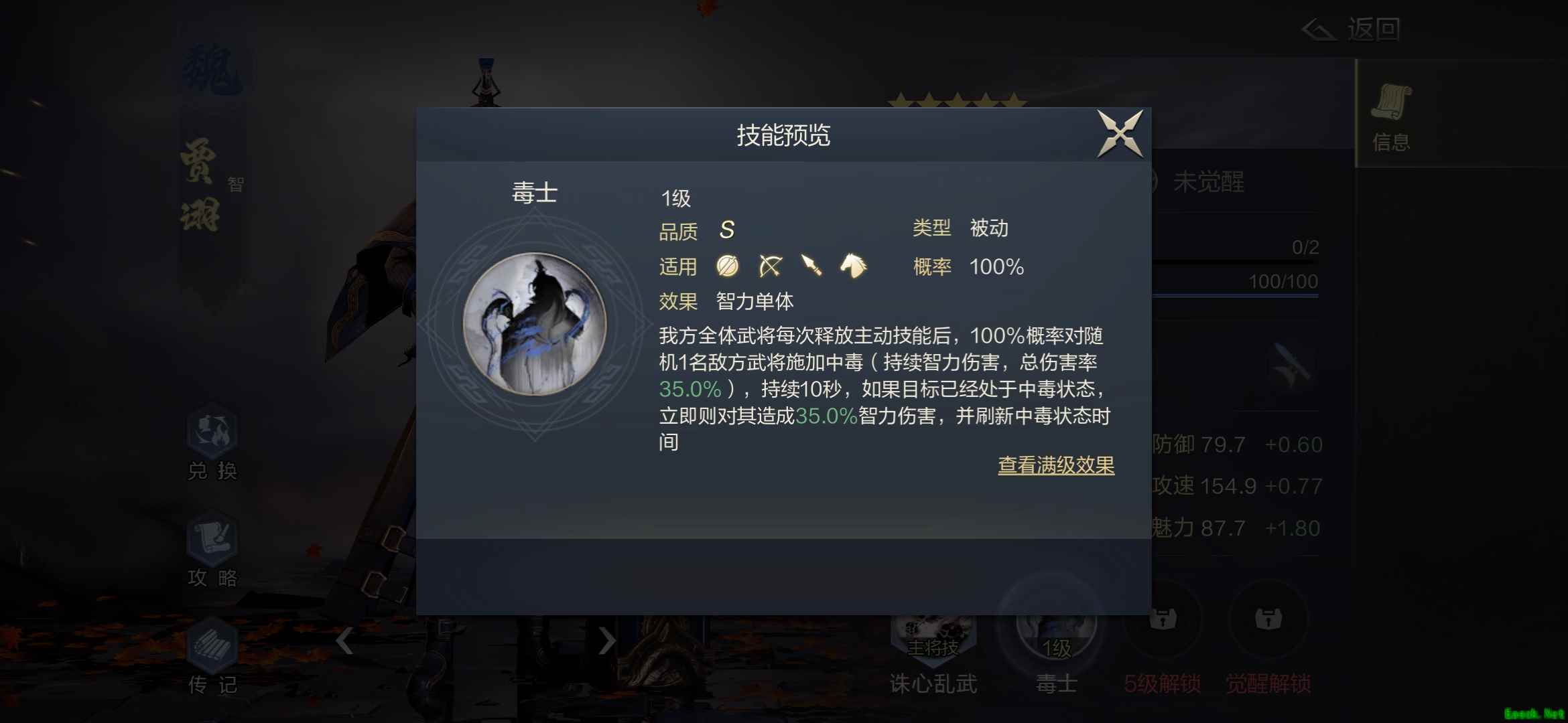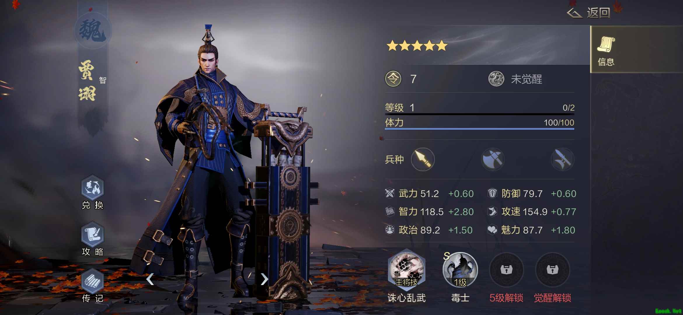 【武将属性与羁绊大全】 《鸿图之下》贾诩属性与羁绊大全强度分析 贾诩,不负毒士之名,技能带毒伤,不过异常伤害目前体系感觉还是差了点,最大的优点就是伤害特别稳定。 面板属性