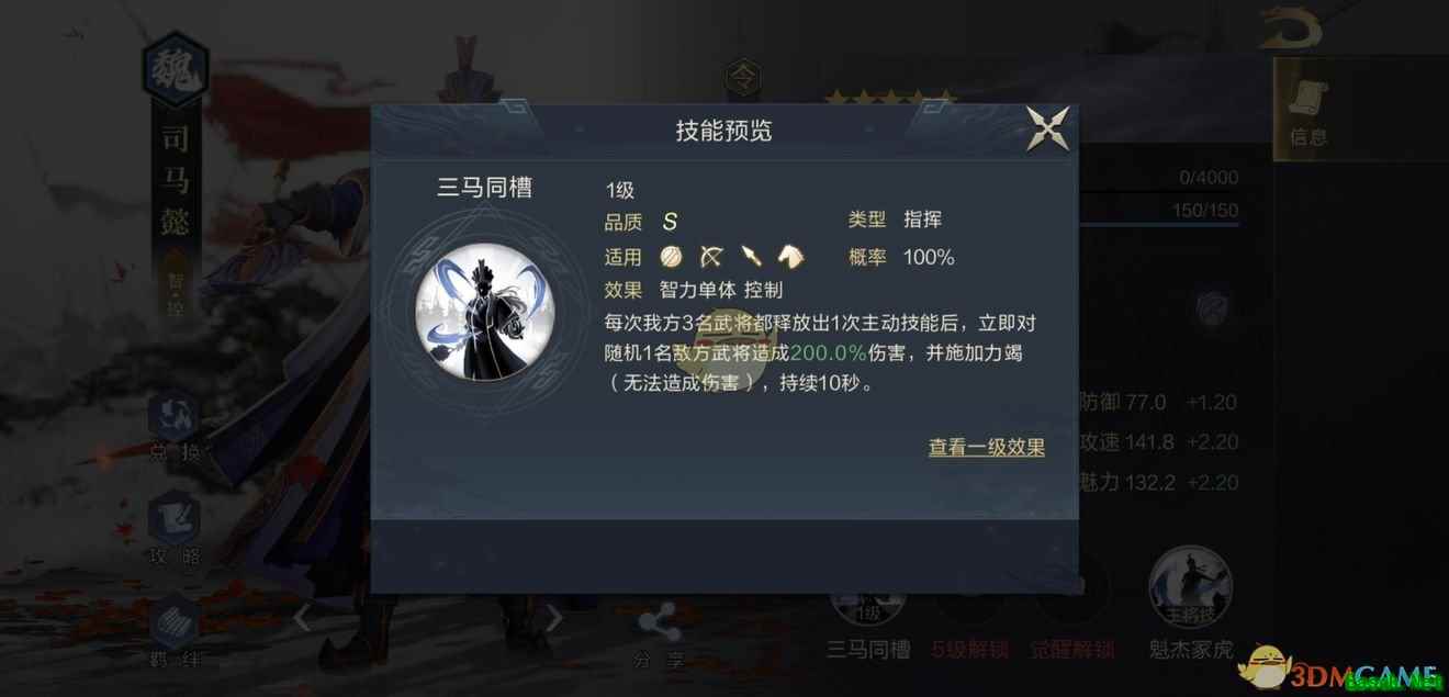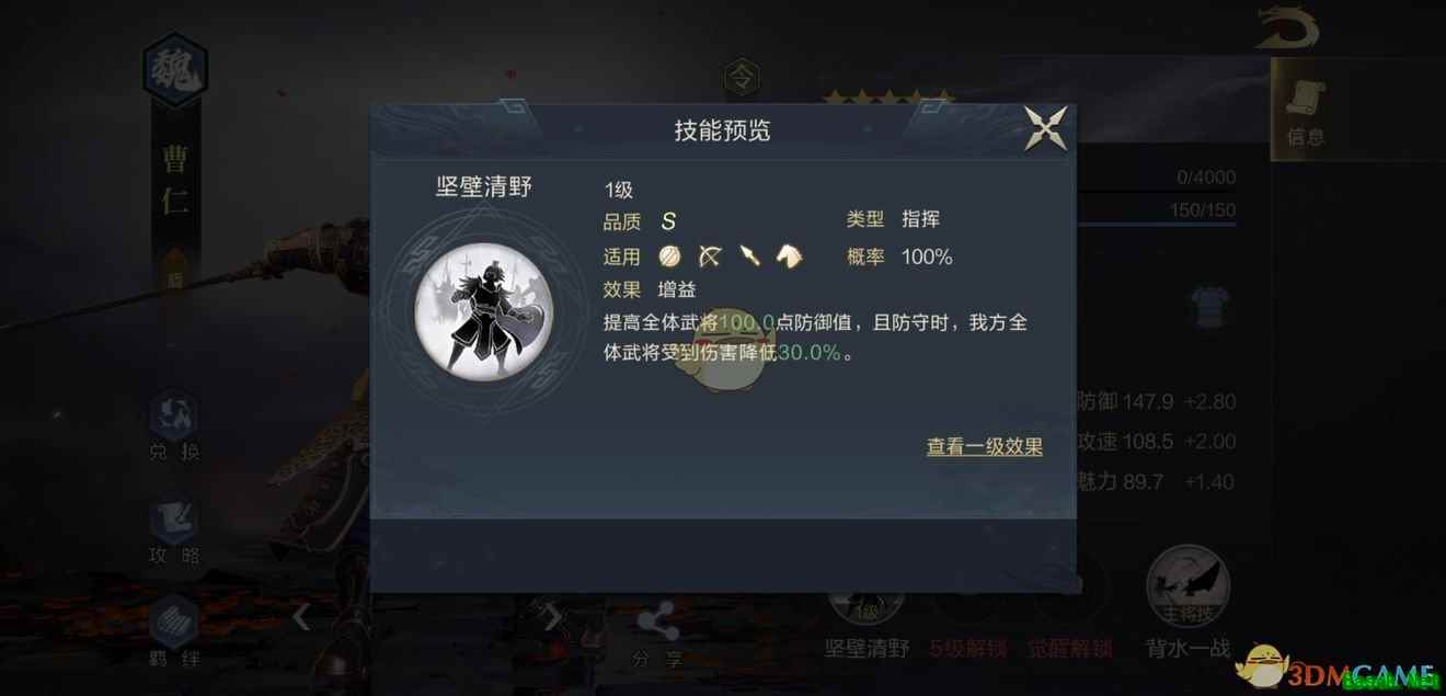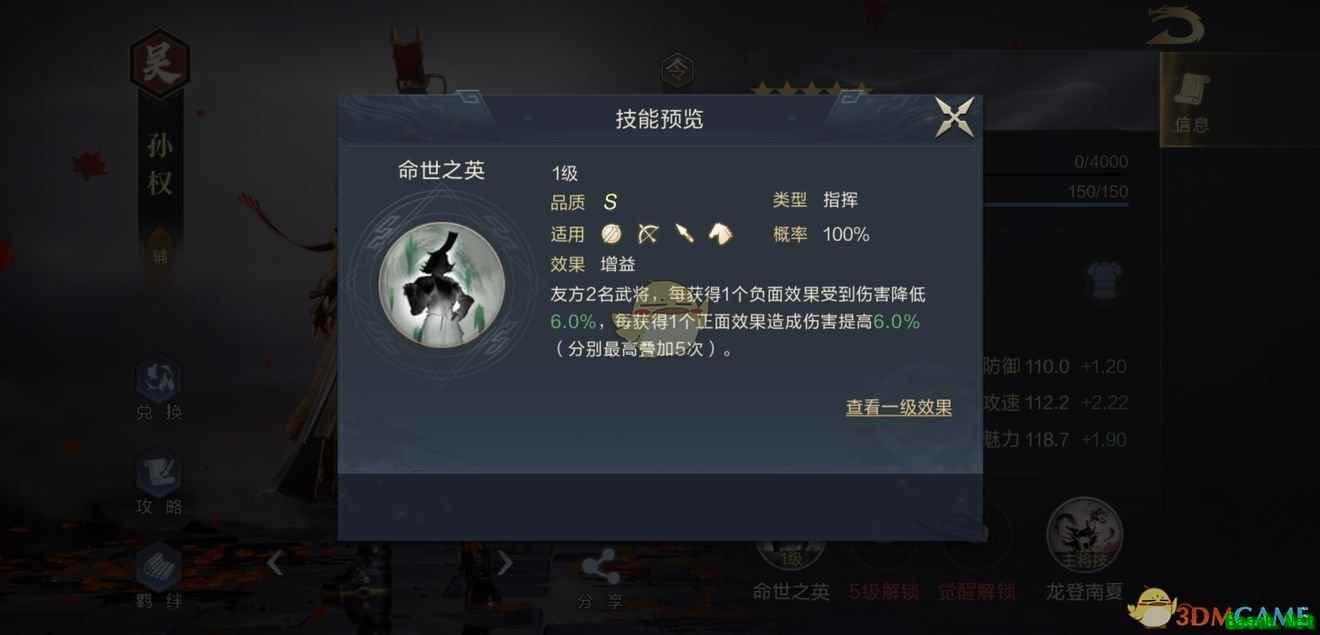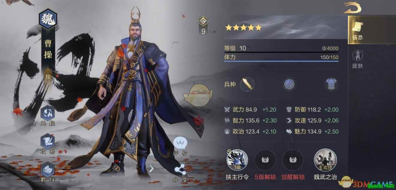 三皇之一,孙权在以往几次测试中凭借一手命世之英的增伤减伤效果打响了他万金油的招牌,无论是组羁绊队伍“猛虎一脉”(三孙),还是混搭其他队伍强度都是处于较高水准,命世之英给队伍带来的提升实在太大了,满层Buff全体30%的增伤和30%的减伤,虽然可以被驱散,但是在buff满天下的鸿图,想叠起来也不是什么难事,所以暂居第一,绝对的第一核心,任何队伍都可以搭配。 第二名:曹操