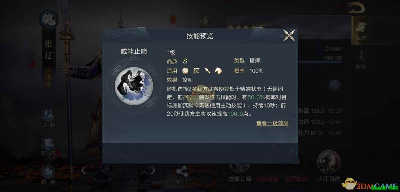 阵容搭配灵活,输出又高又稳定,而且还可以稳定力竭对面一个目标,但是弱点也比较明显,司马需要3个武将都释放技能才能触发他的三马食槽,你任何一个武将哑火了或者被控了,那么输出就肯定就少一大截,而且最新测试***伤害也被大砍,我都感觉他第七核心的位置都要不保了。 第八名:张辽
