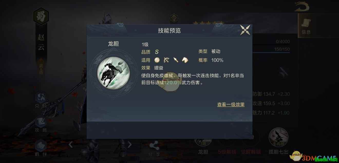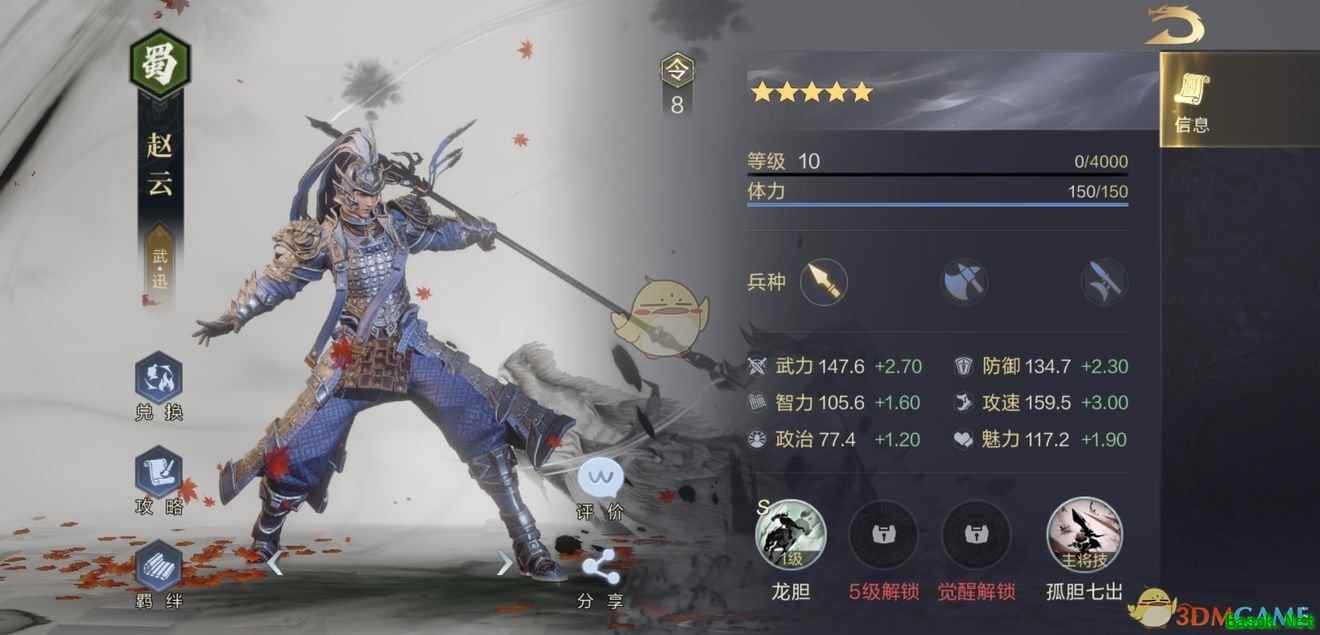 全体主动战法释放概率增加,免疫一次战法效果,你没有听错!这就是诸葛亮,鸿图“战法发动机”,让你的主动队伍稳定性大大提升,输出更加爆表,更何况其冠绝鸿图的3.0智力成长,但是由于其弓兵兵种限制,在配将方面存在一些不足之处,因此我只能暂时将他放在第五核心了。 第六名:赵云