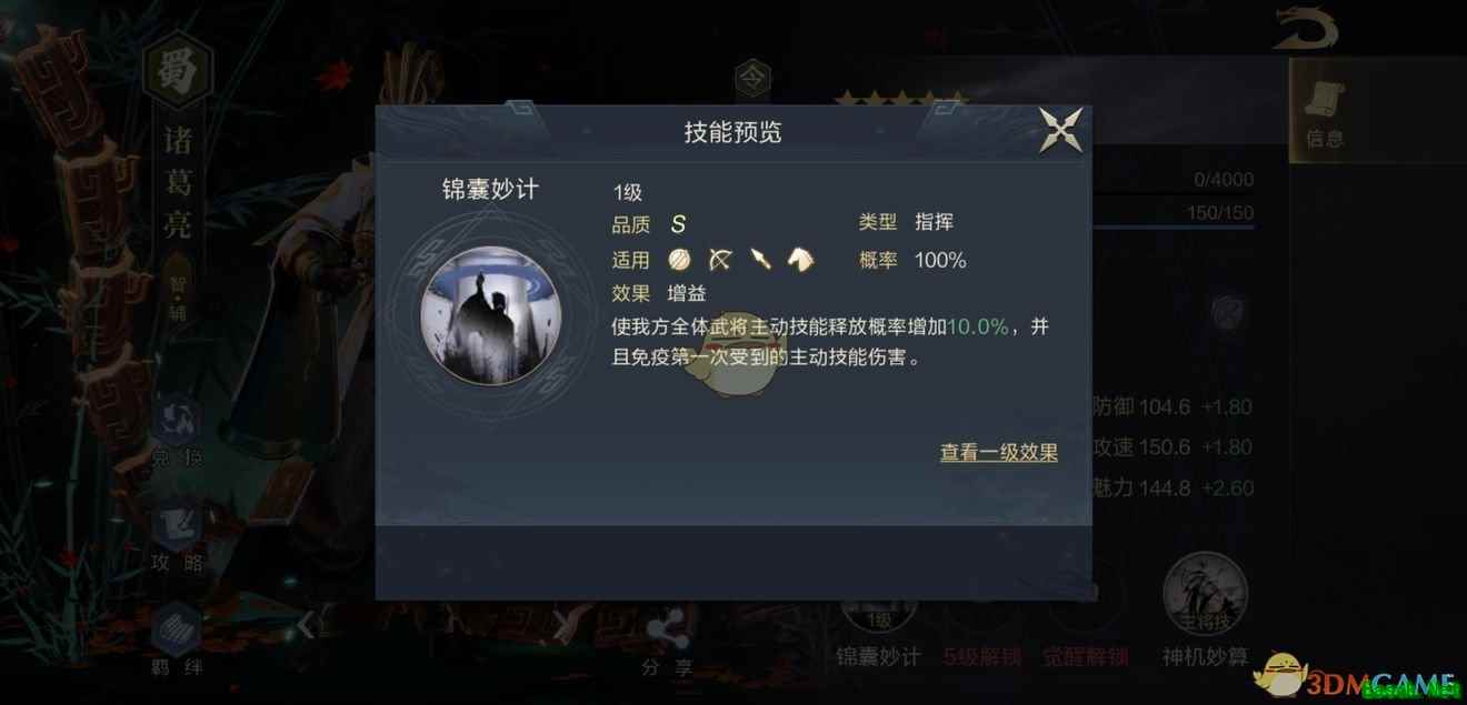 在主动鸿图里面,郭嘉的强度在某些方面甚至超越了曹操,为其带上计略和忌克两个稳定毒Buff技能后,其高达70%的双目标沉默的控制效果让人抓狂,而且是10秒可以触发两次的效果,如果是主将甚至可以达到3次,直接能让对面3个将全程哑火挨打,是各位法师队,主动武力队的亲生爸爸,因此在目前鸿图的主动为主的环境中,郭嘉可以稳住第四核心的位置。 第五名:诸葛亮